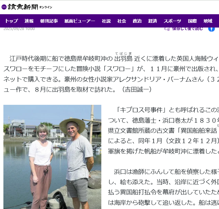 英国人海賊ウィリアム・スワローの漂着事件を題材にした冒険小説が豪州で出版され、作家が徳島の出羽島を訪問。